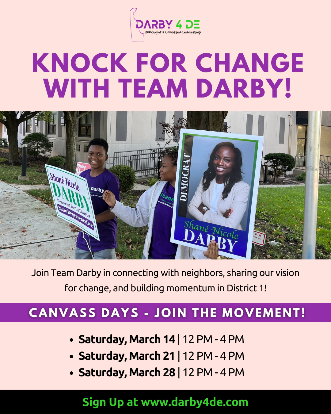 Join Shané Nicole Darby as she goes out in Delaware’s District 1 to connect with voters. No experience is needed - just bring comfortable shoes, water, and a willingness to talk with neighbors.