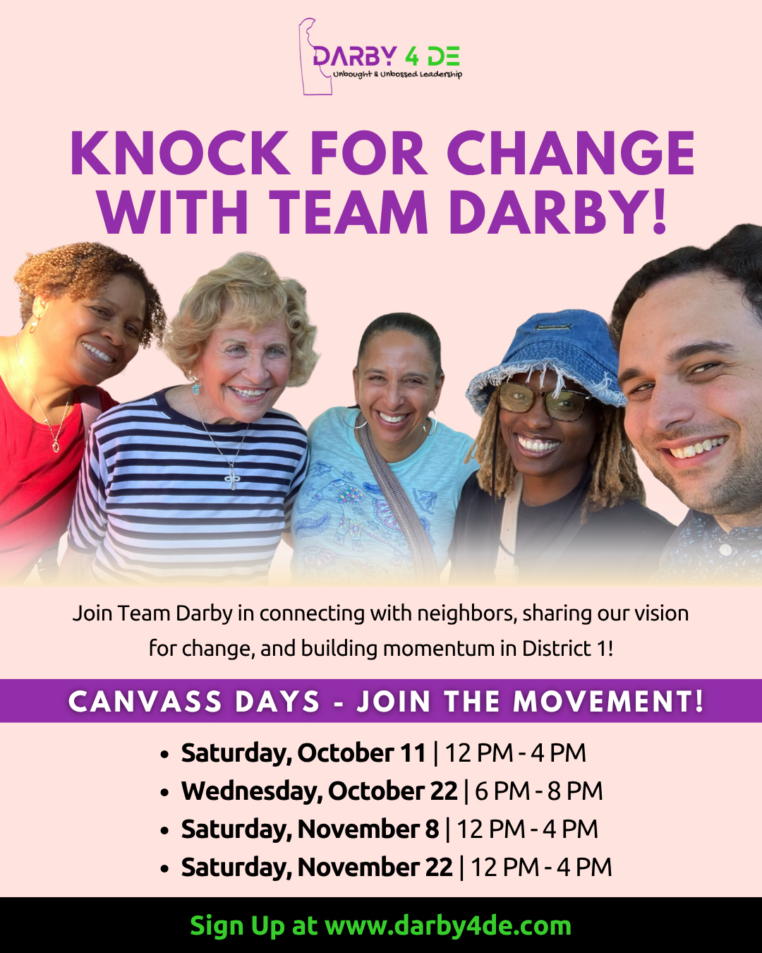 Join Shané Nicole Darby as she goes out in Delaware’s District 1 to connect with voters. No experience is needed - just bring comfortable shoes, water, and a willingness to talk with neighbors.